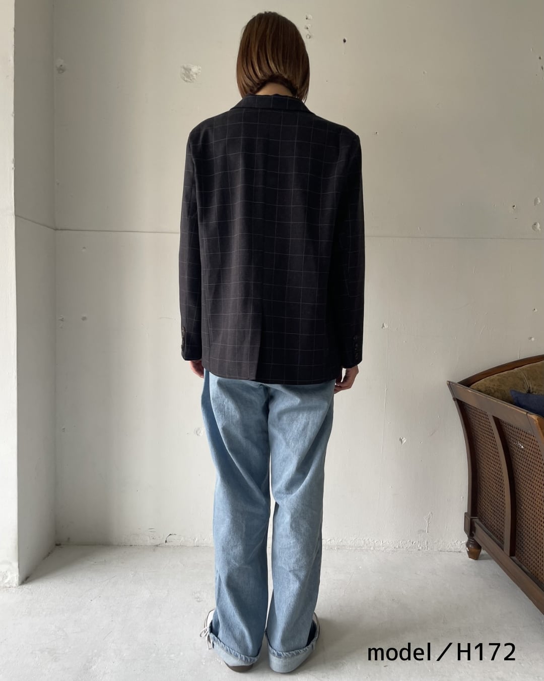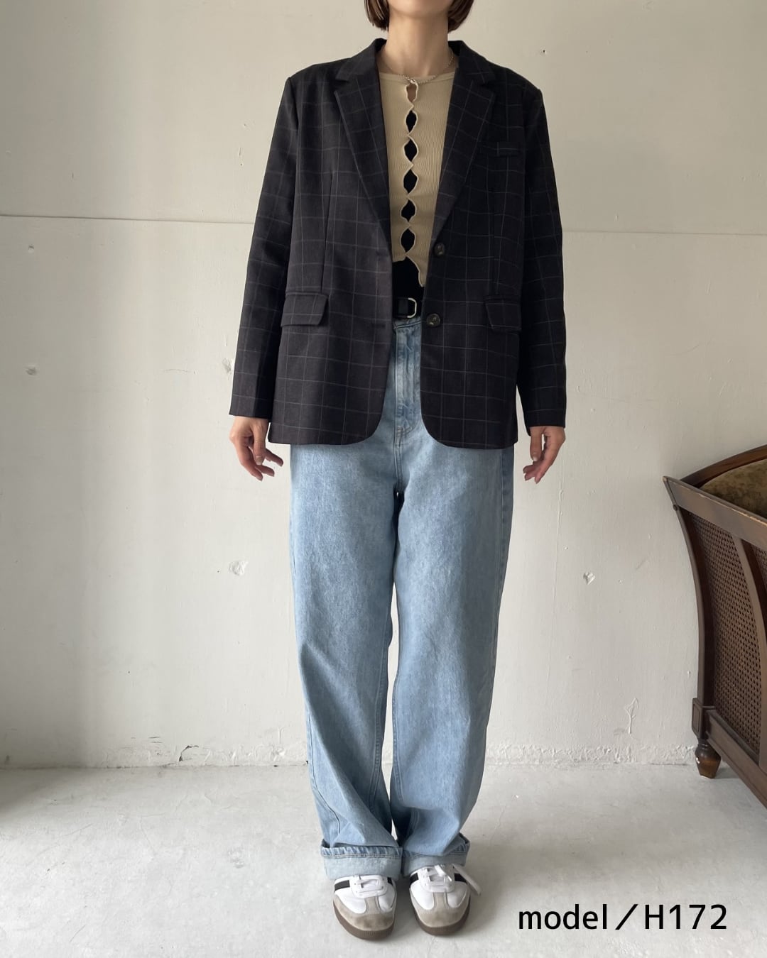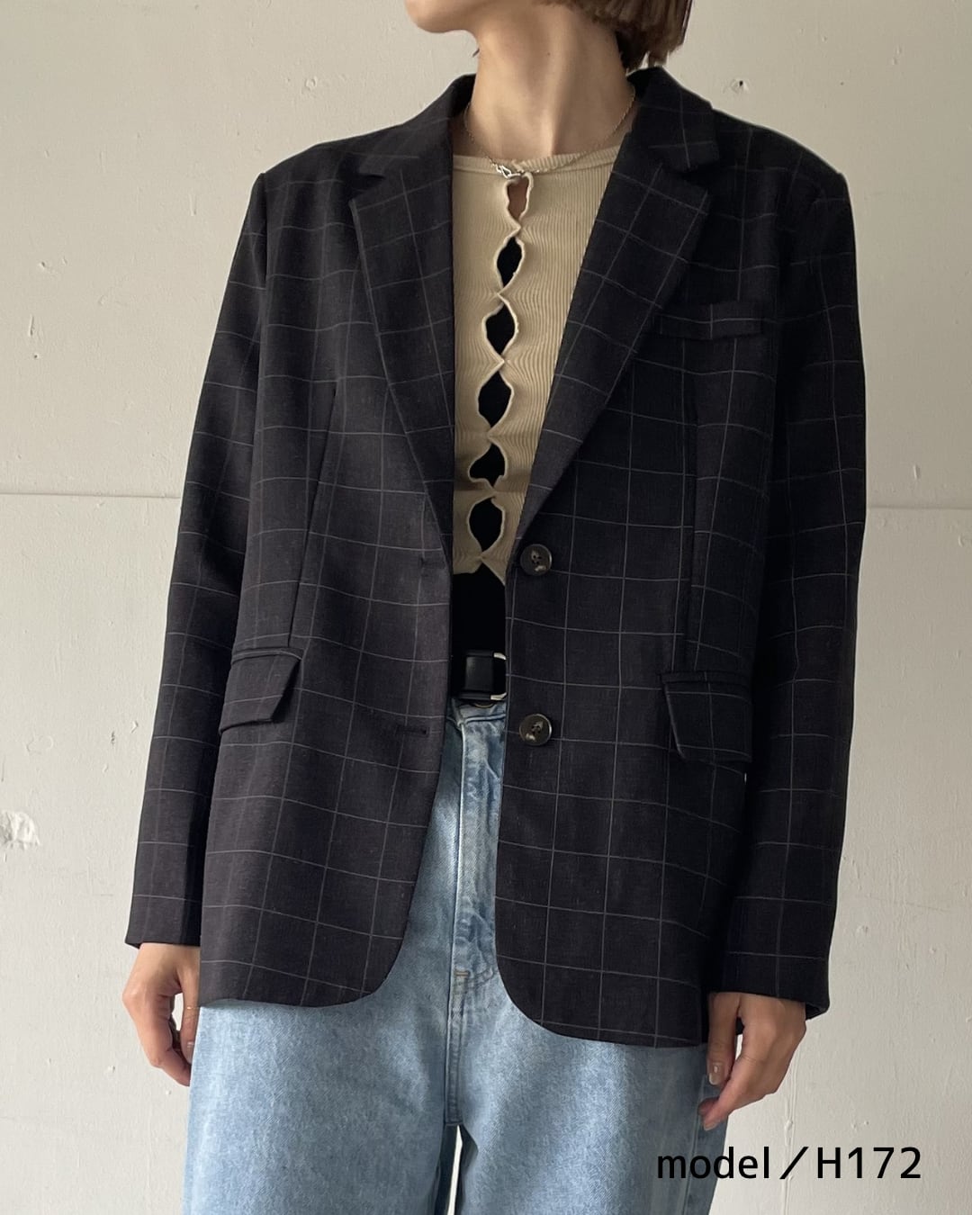 落ち着いたチェック柄が印象的な、リラックスシルエットのテーラードジャケット。