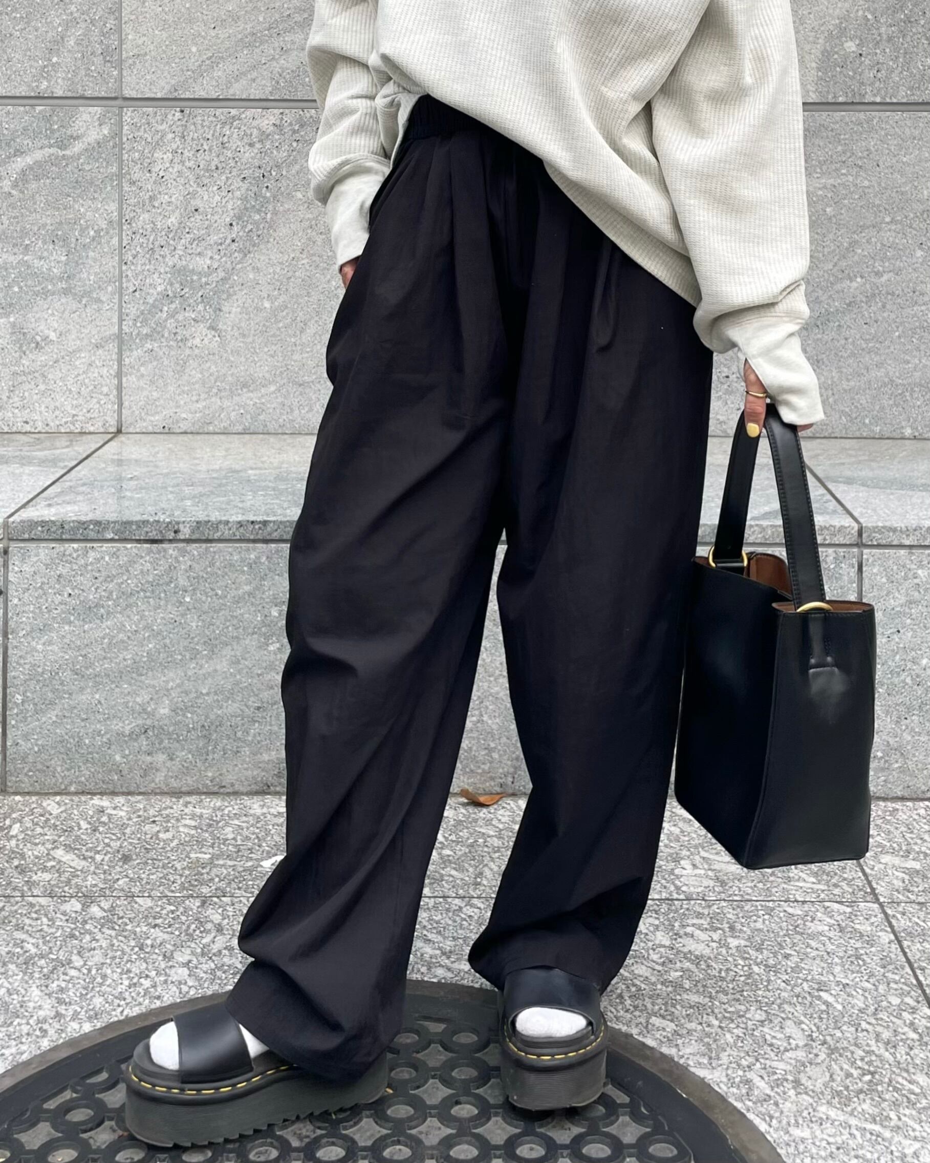 ウエスト総ゴム仕様でイージーな穿き心地でありながらタックの入った美シルエット。表面感のあるややシャカっとした素材が特徴です。